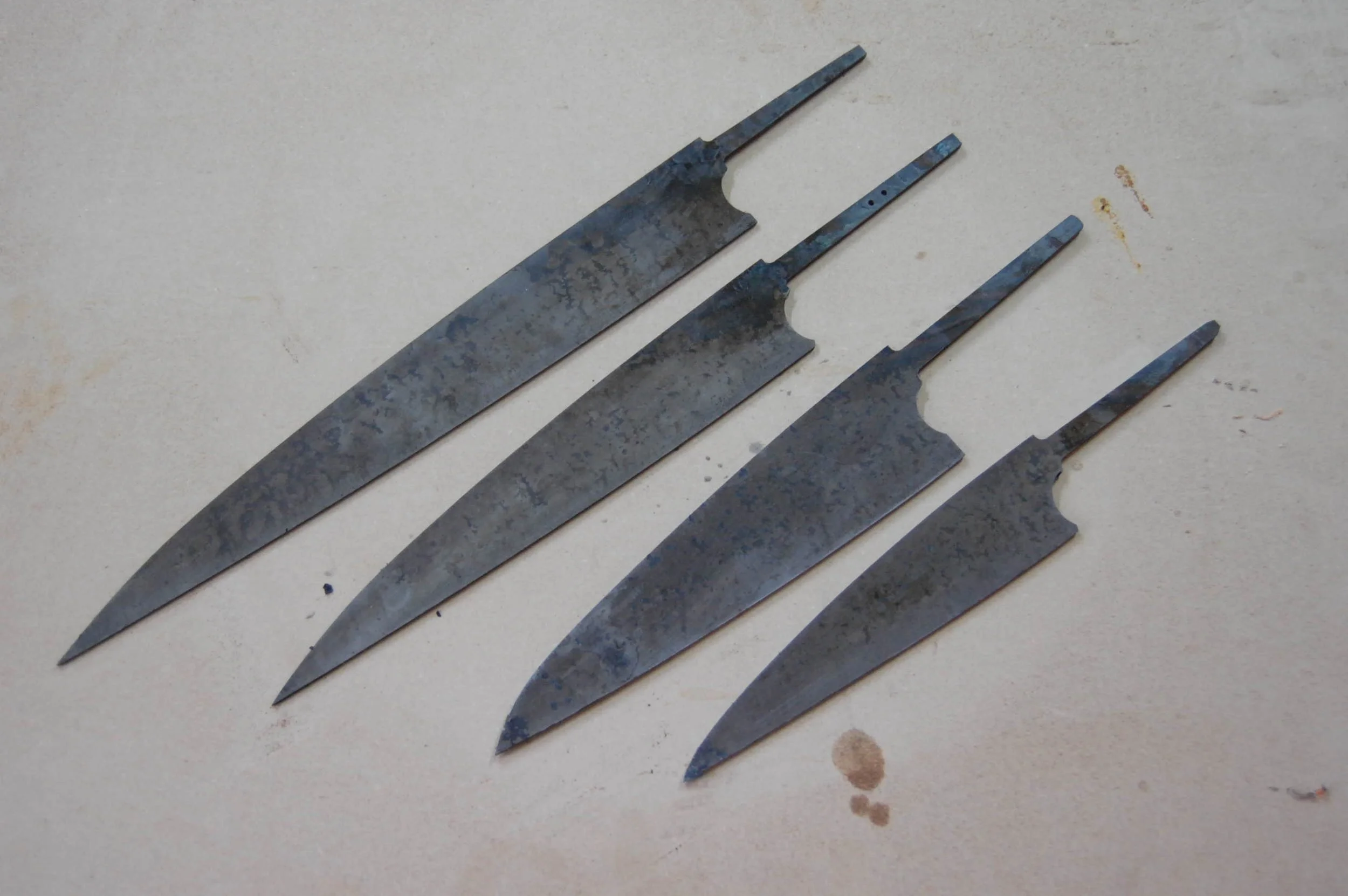 Not much to look at now, but they are pre ground and heat treated. Top to bottom: sujihiki, custom gyuto-suji, gyuto, and a petty.