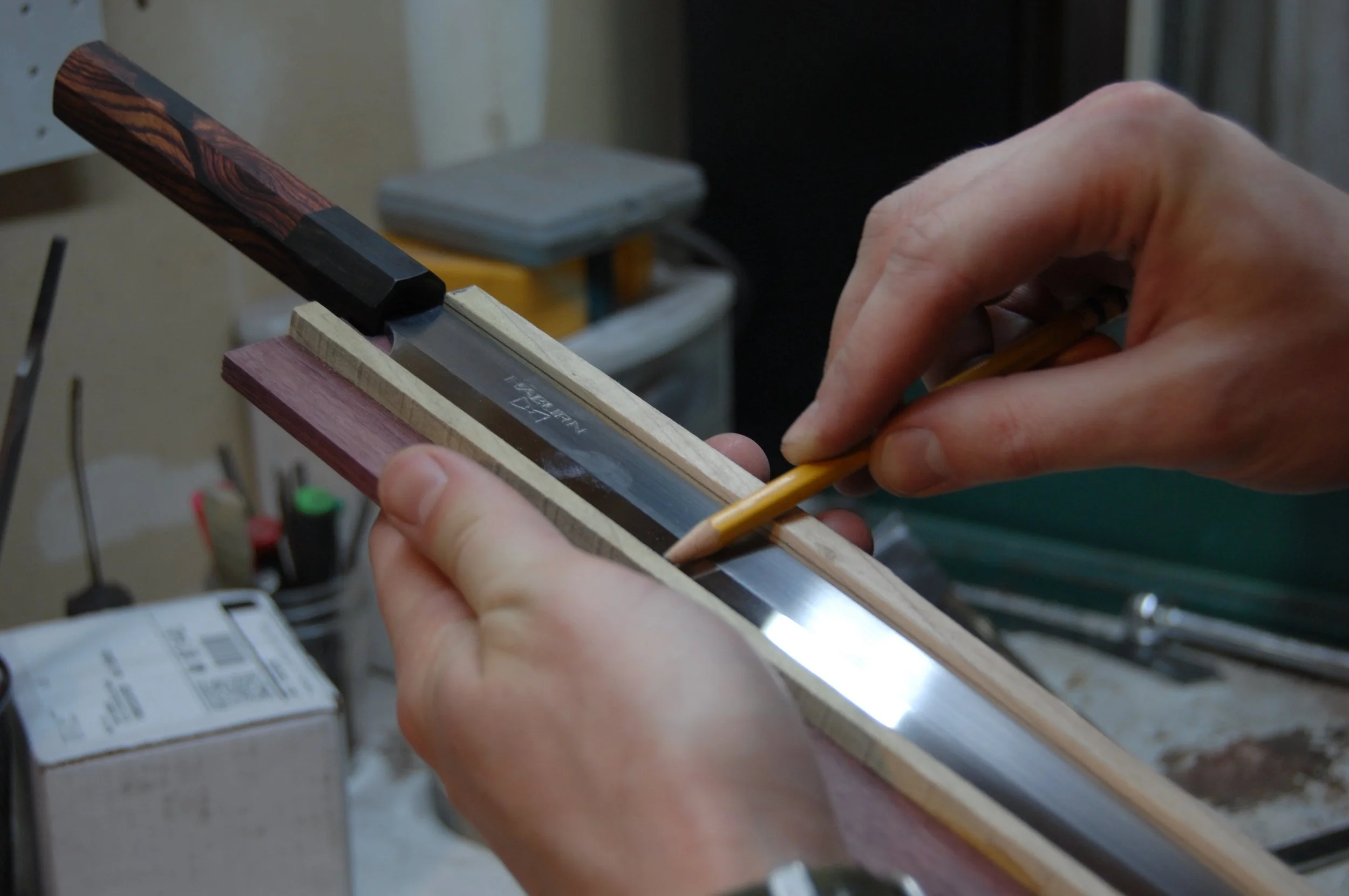 I've got the saya started and I'm marking the cut line that butts up against the ferule.