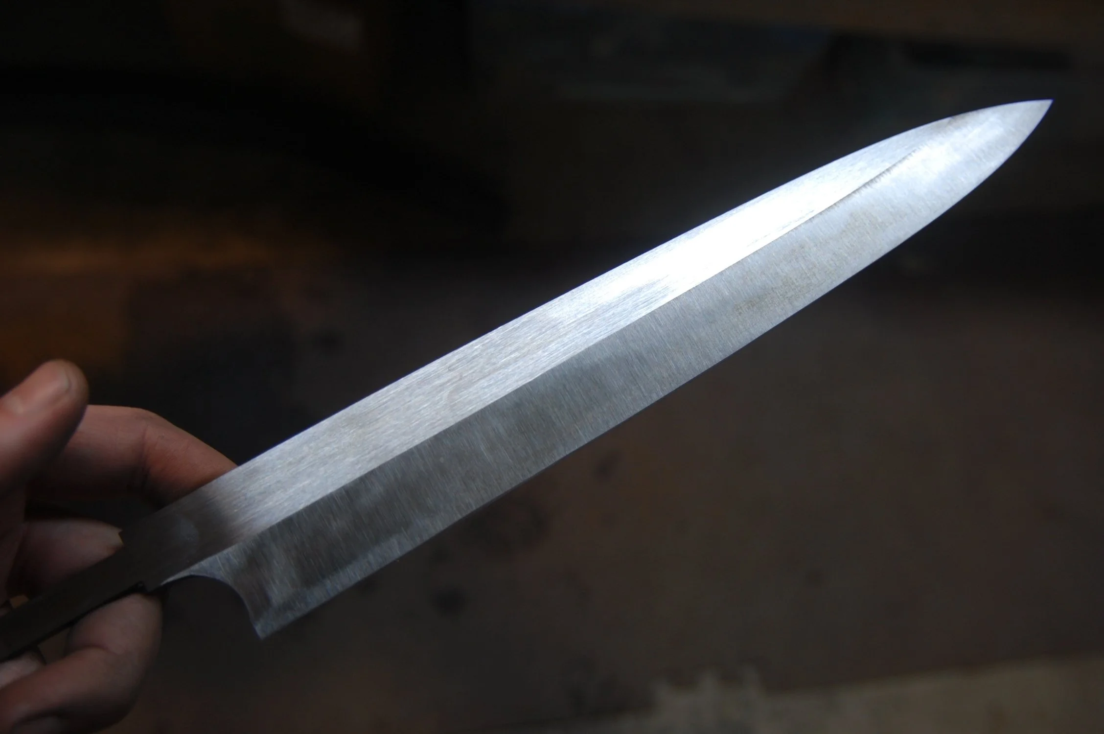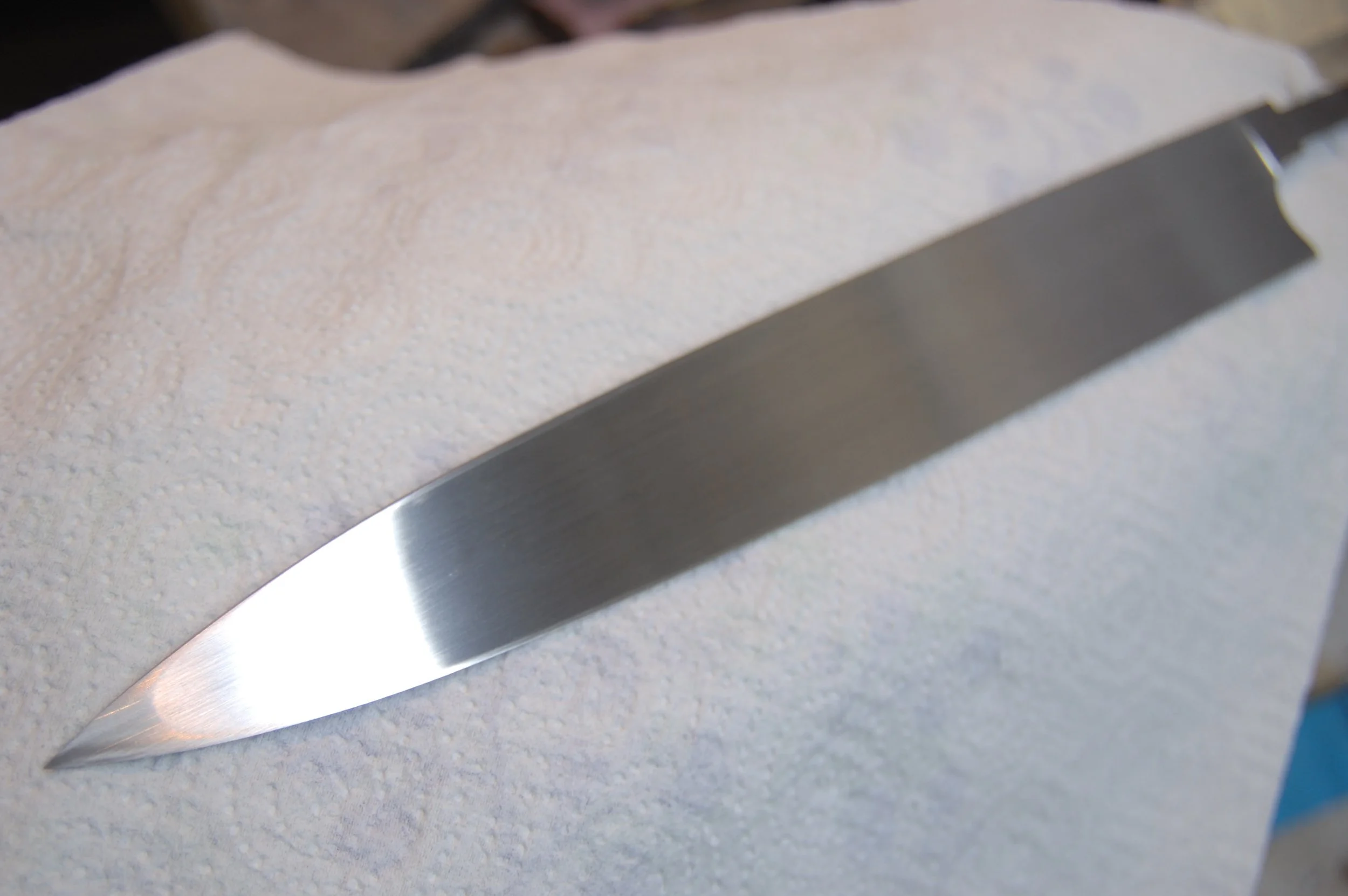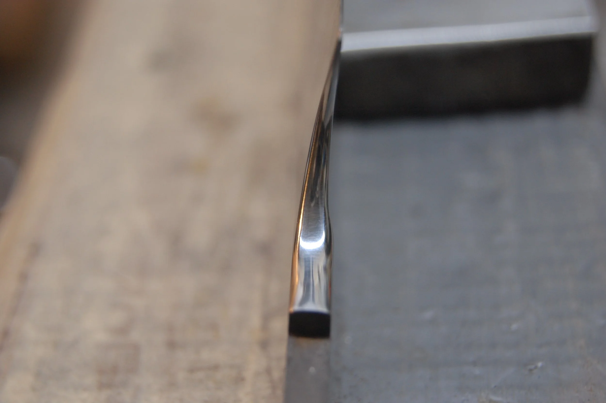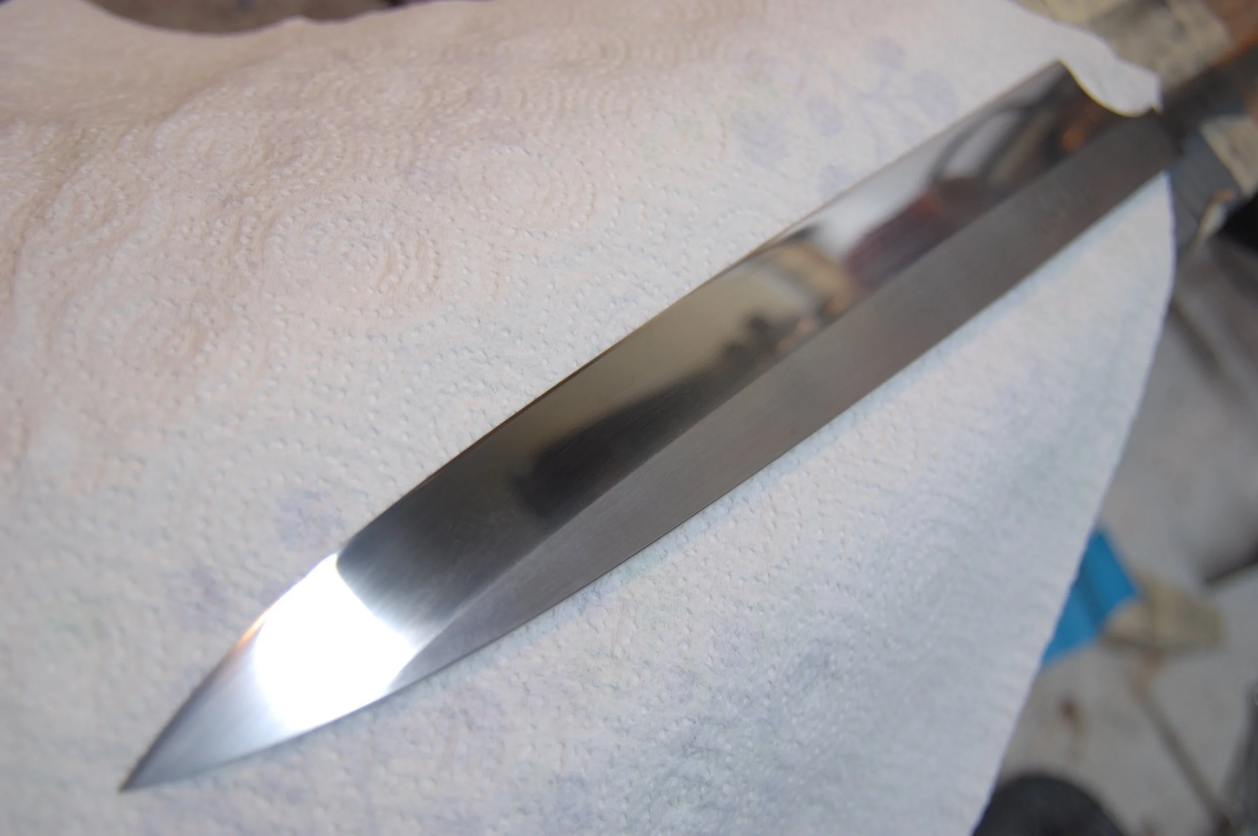 The urasuki after much hand sanding. You can see the edges/uraoshi have a higher polish. This will be brought out later when the final sharpening is done.