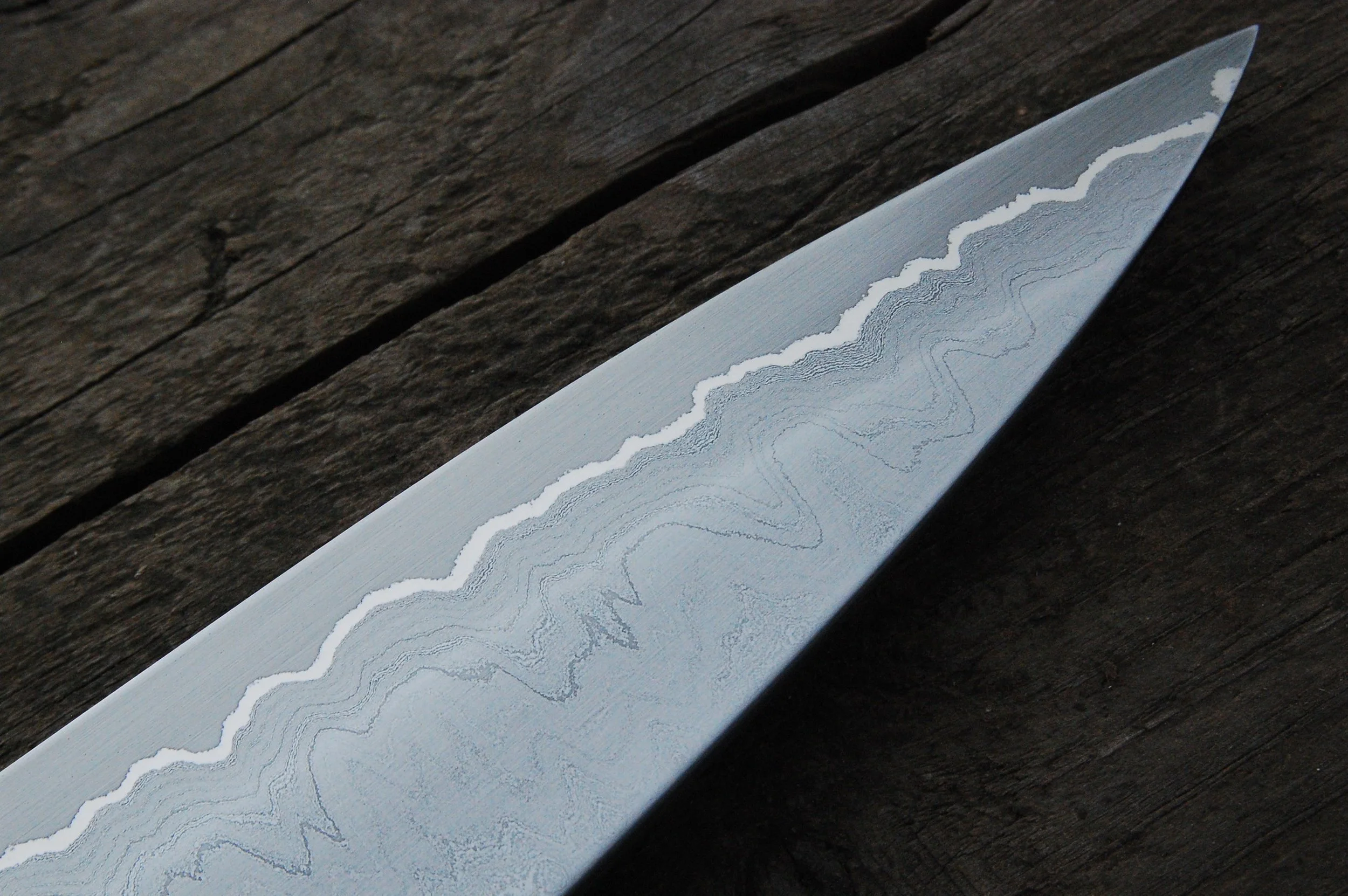 The core steel, 52100 high carbon is laminated with a jacket totaling 750 layers creating a super fine damascus pattern. This will be available for sale.