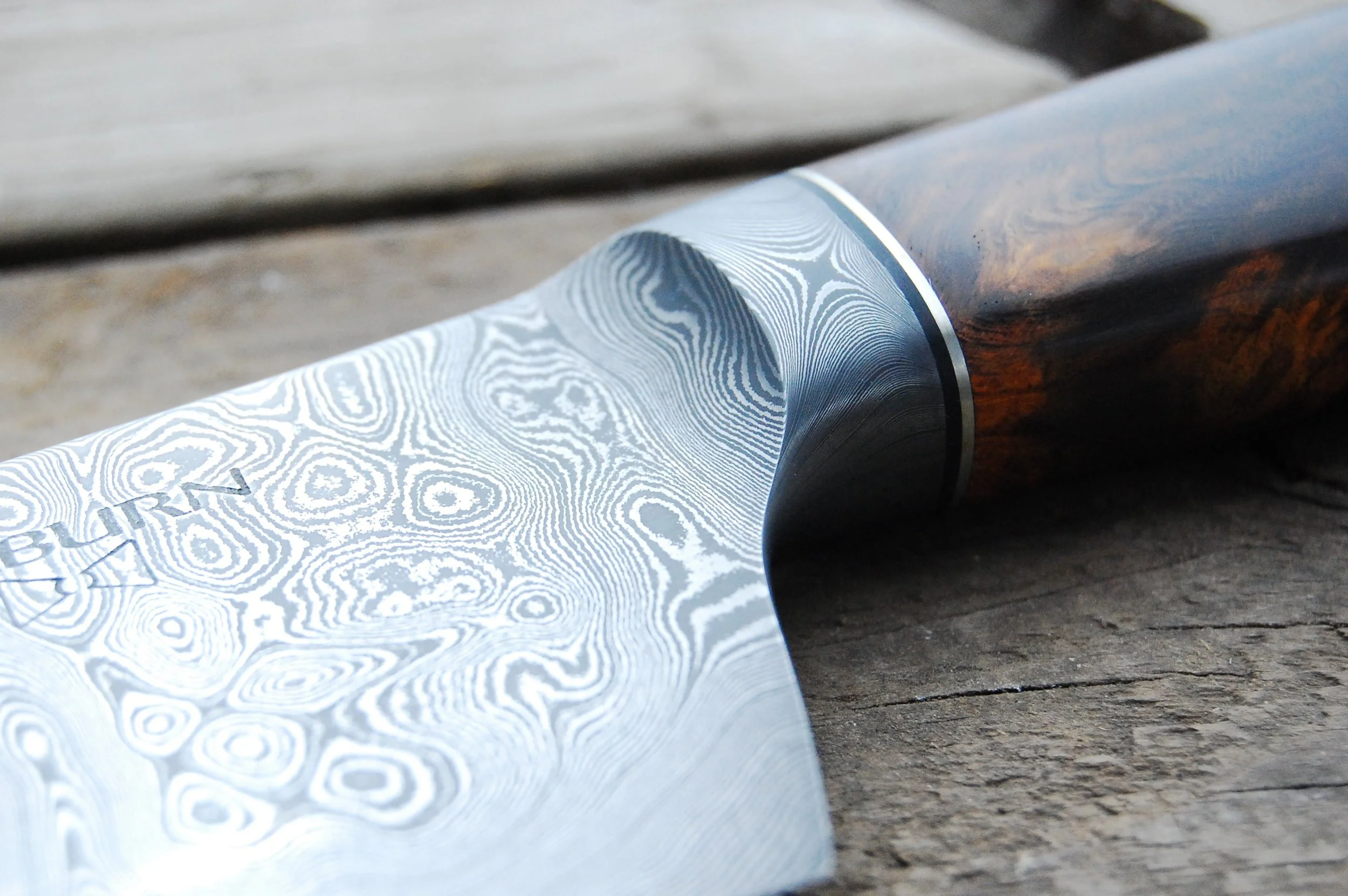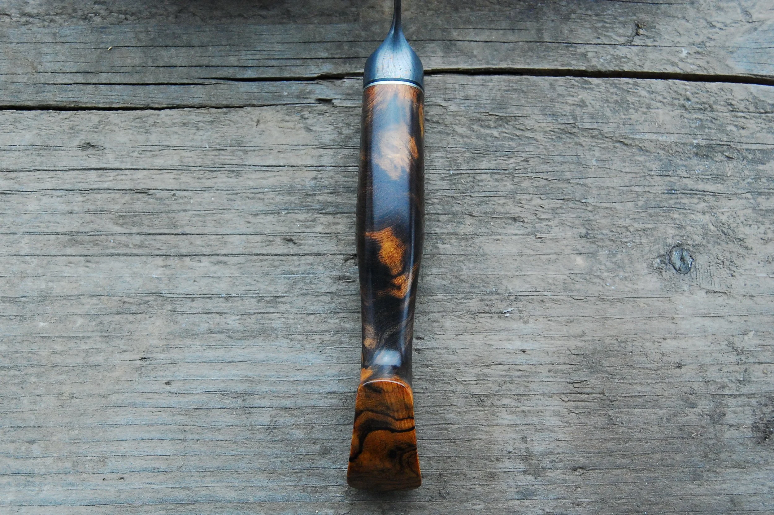 225mm, 375 layer damascus integral gyuto with a nickel silver spacer and an ironwood handle.