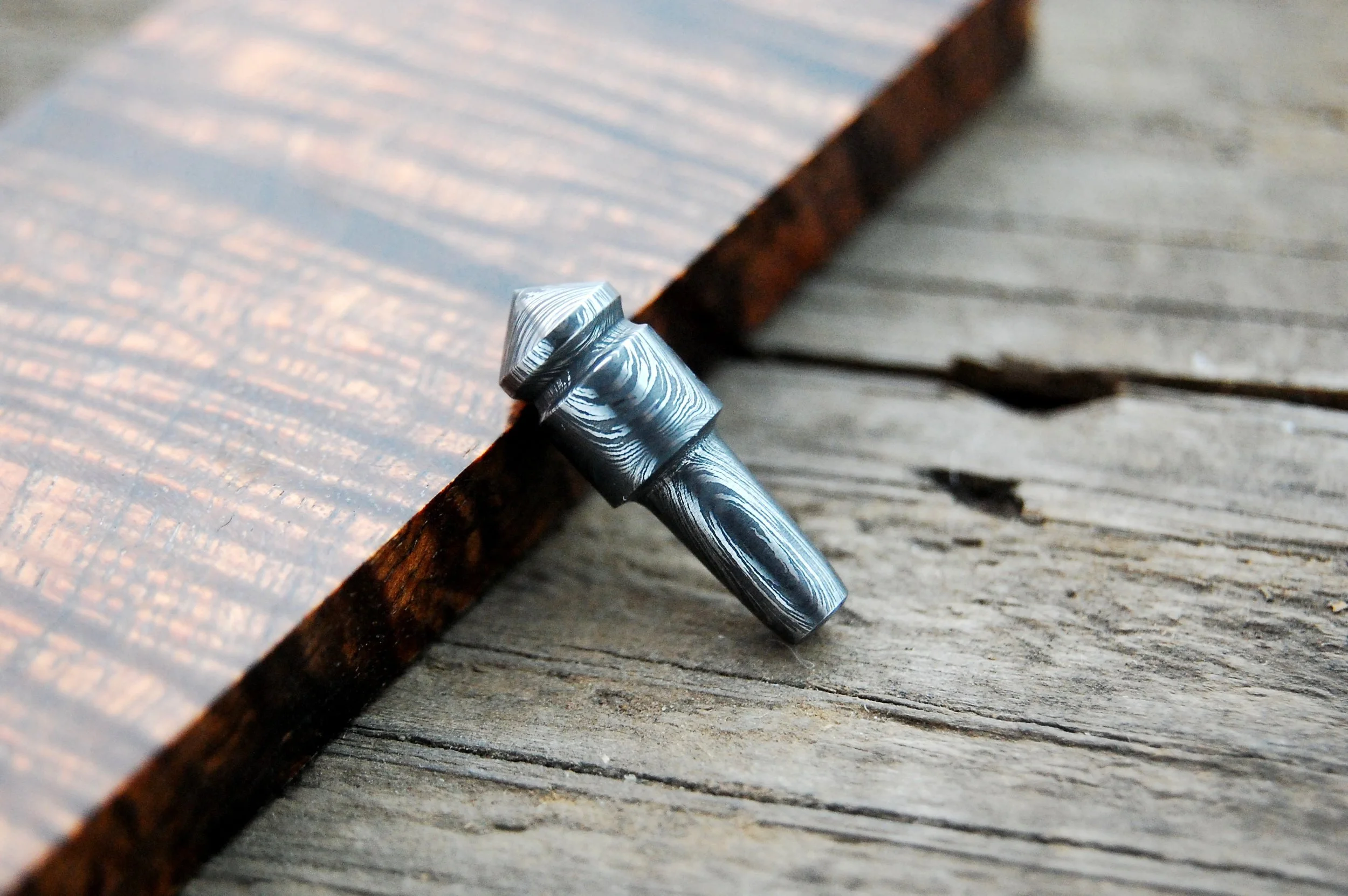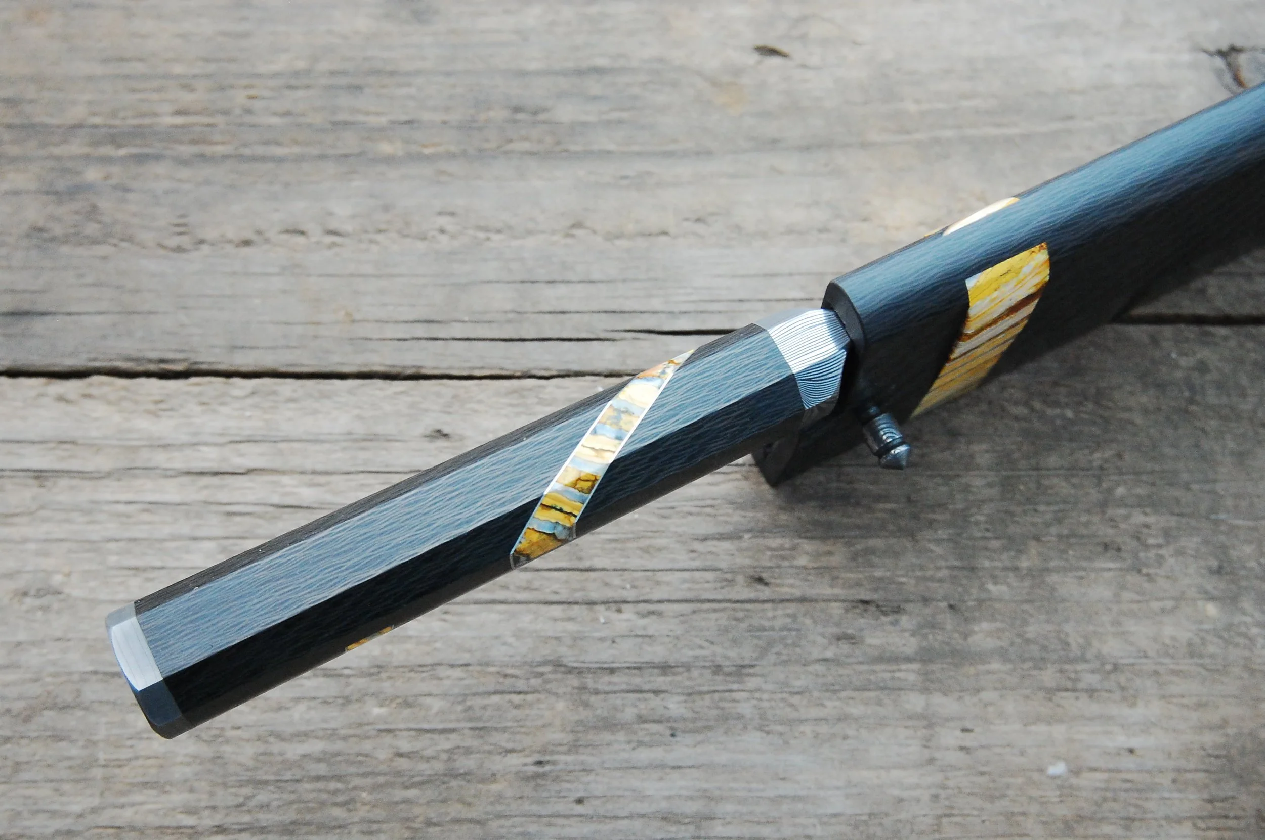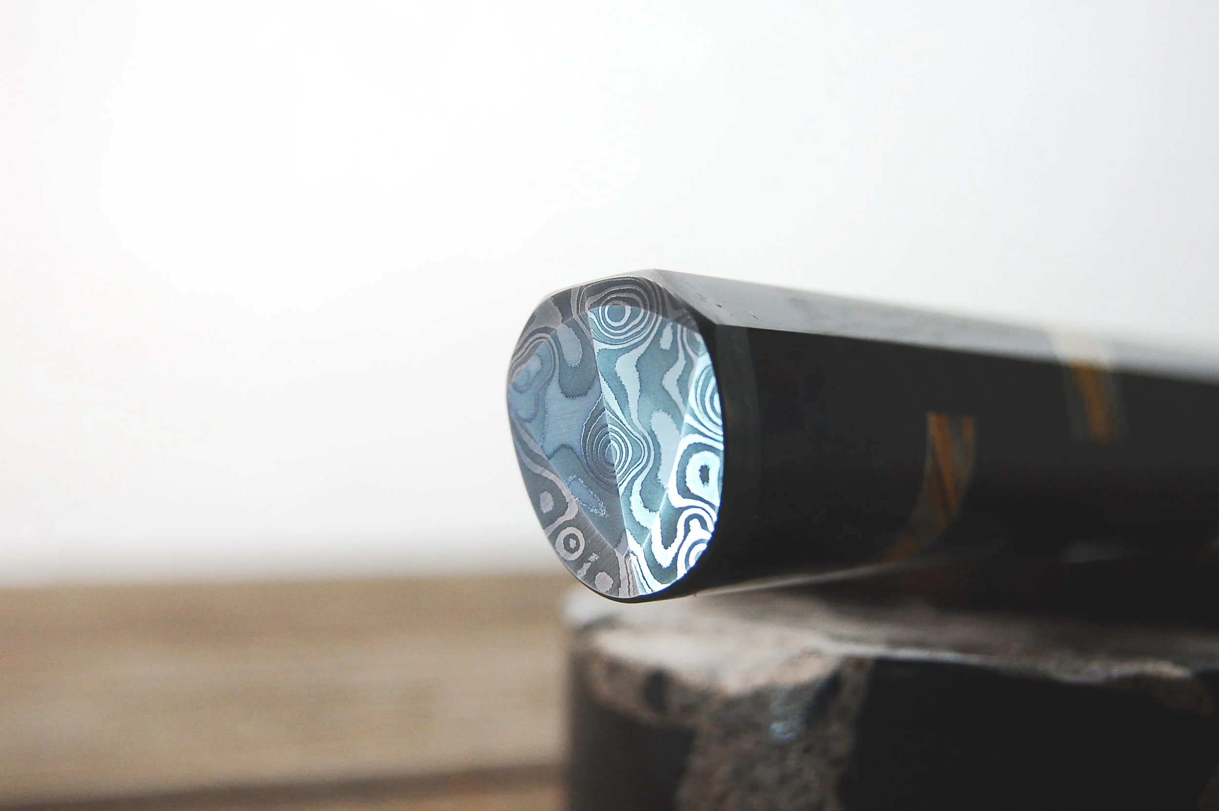 Custom integral raindrop damascus usuba kamagata. Carbon fiber handle inlayed with yellow mammoth tooth and pure nickel capped with a faceted damascus butt cap. The saya is carbon fiber milled to matched usuba grind and lined with supple pig skin. The saya is asymmetrical to match the blade and inlayed with matching mammoth. Feather damascus keeper pin keeps the blade snug and protected.