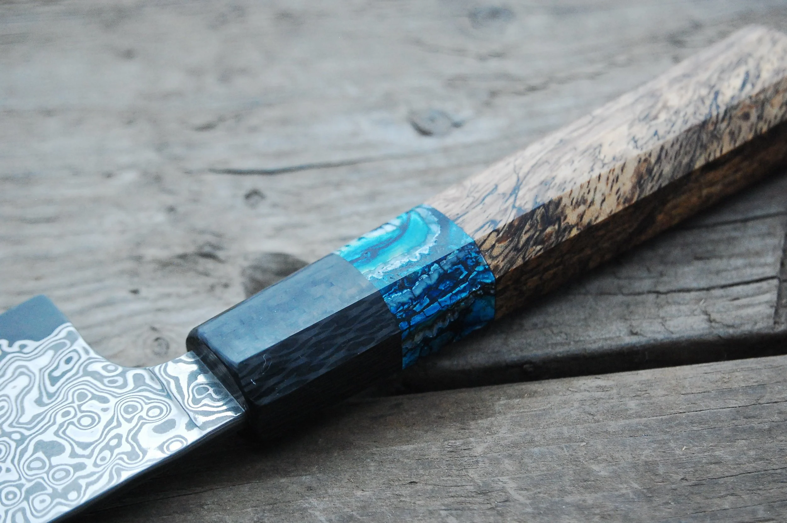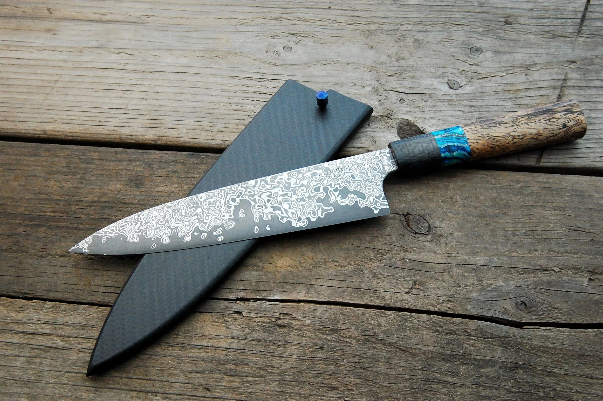I forged this custom gyuto with a stainless raindrop damascus jacket and a stainless core. The handle is carbon fiber blue mammoth tooth and spalted jatoba. The saya is full carbon fiber with a leather liner and a faceted titanium keeper pin.