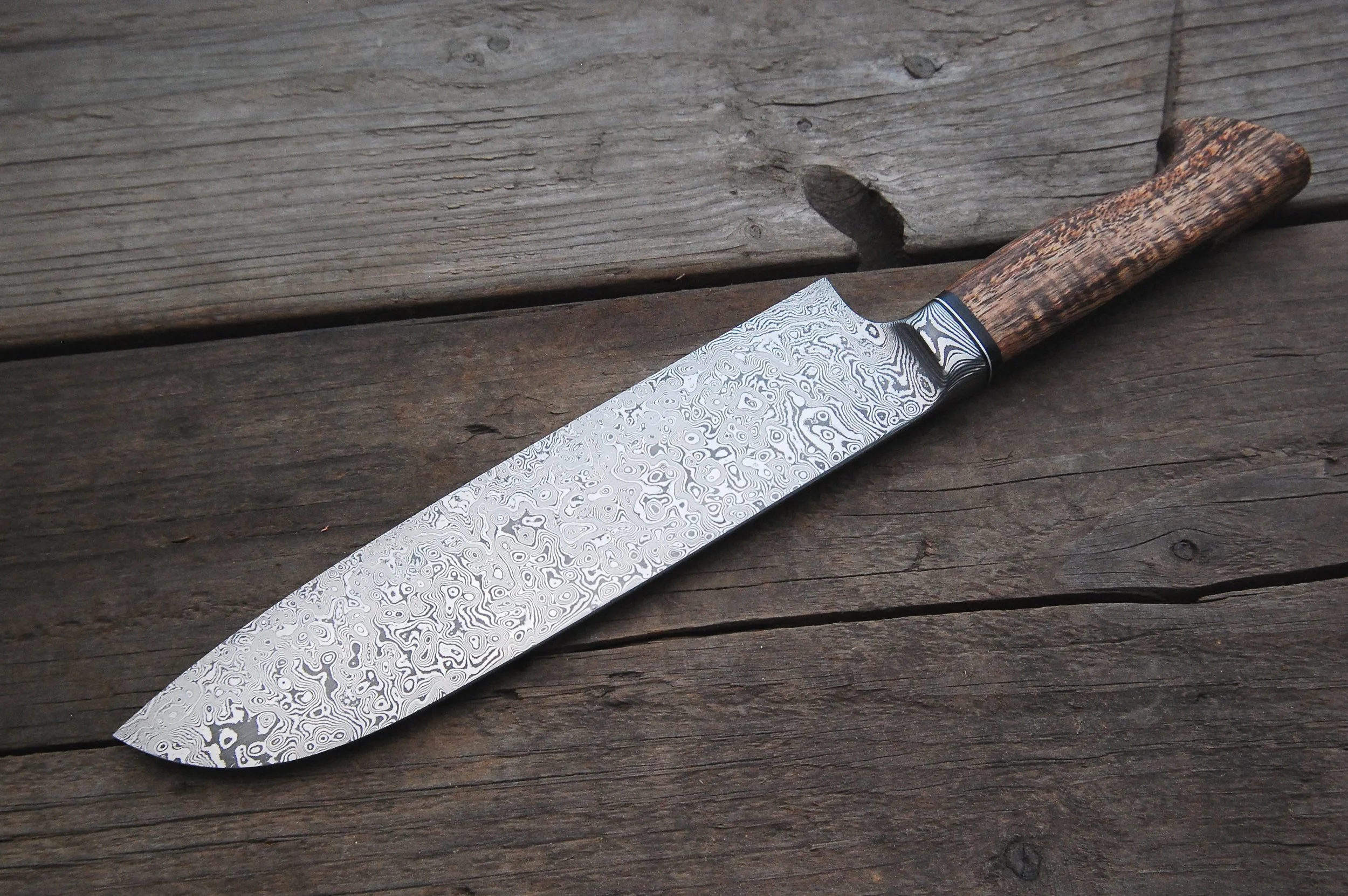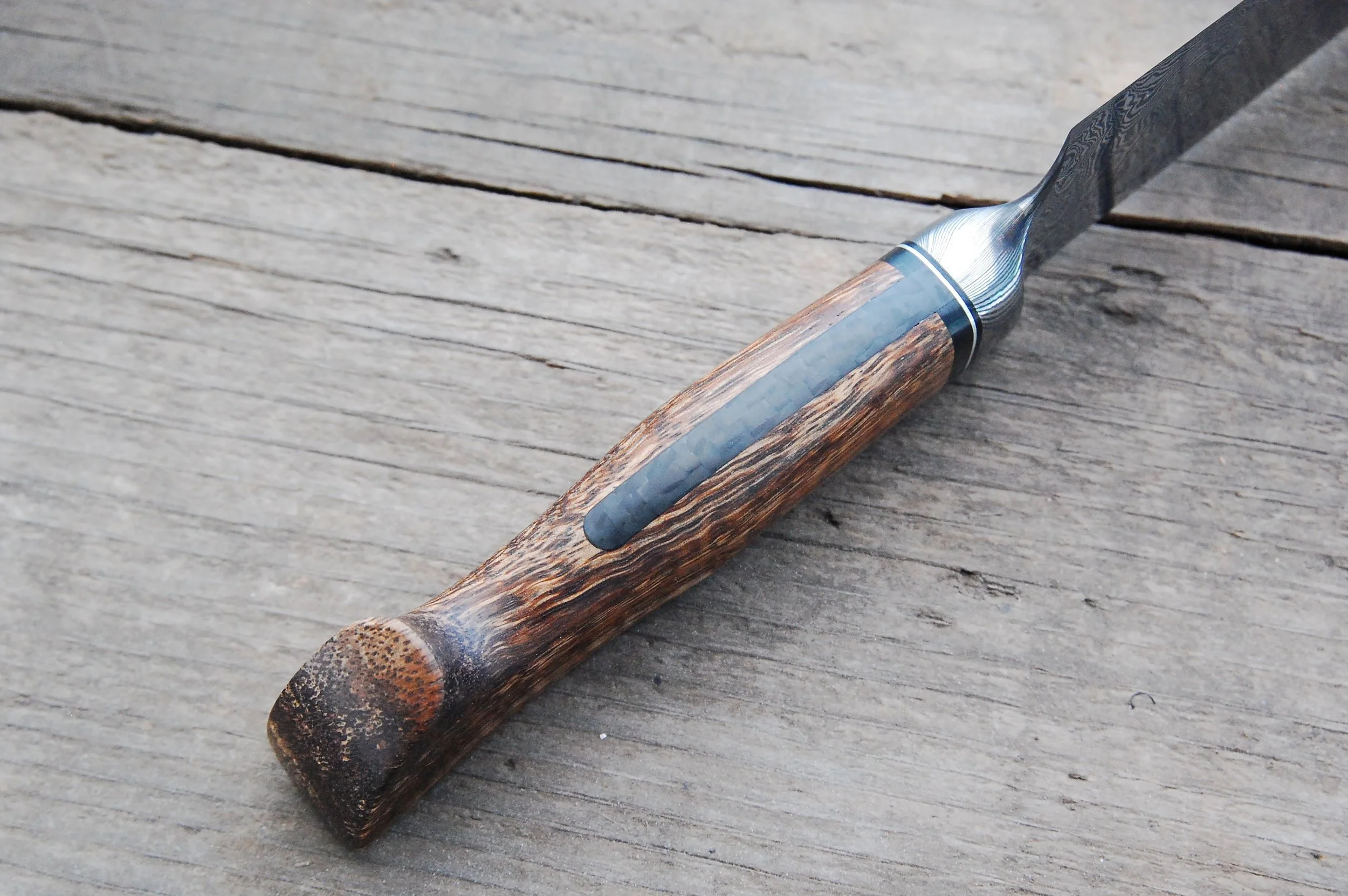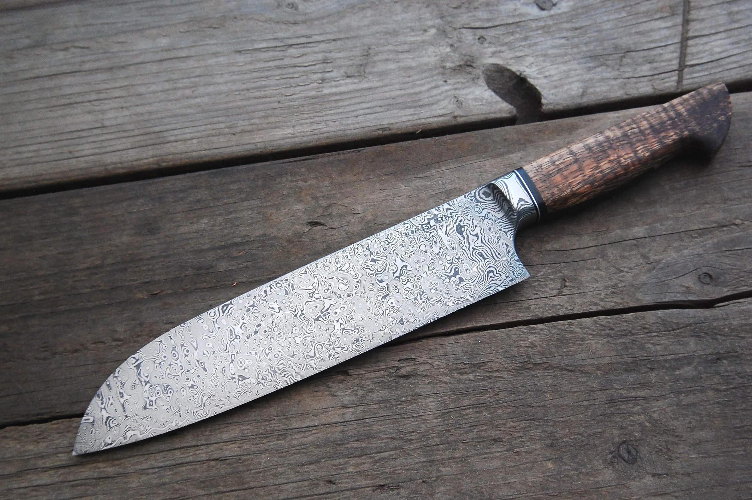 Custom Integral Damascus Santoku Sep 23 Written By Megan Rogers Integral Raindrop Damascus Santoku Curly Hawaiian Koa with carbon fiber inlay. Megan Rogers