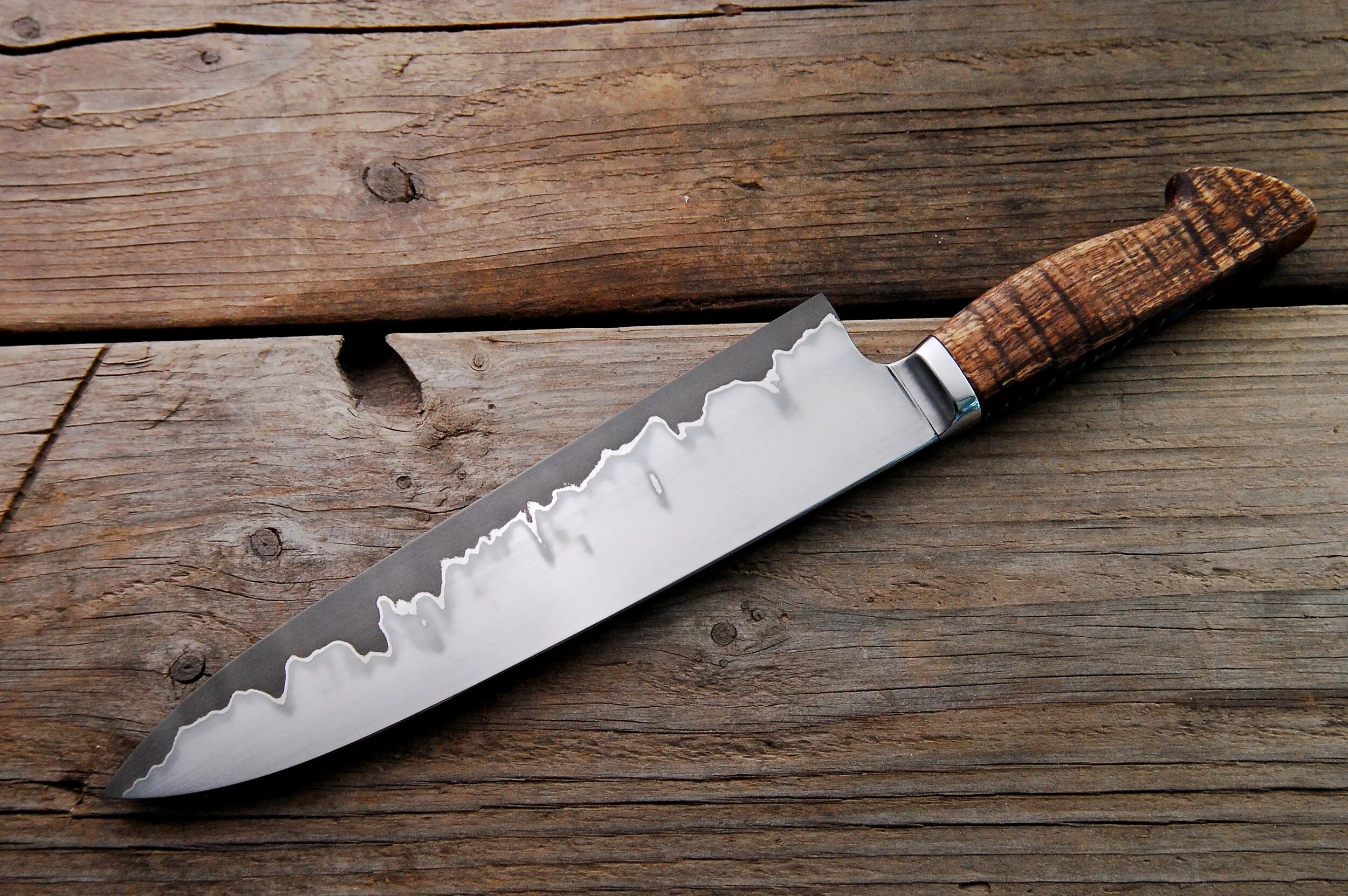 Custom Stainless San Mai Western Gyuto Oct 17 Written By Megan Rogers Stainless san mai with 52100 core. Handled in stainless, curly koa, and featuring a mammoth tooth inlay. Megan Rogers