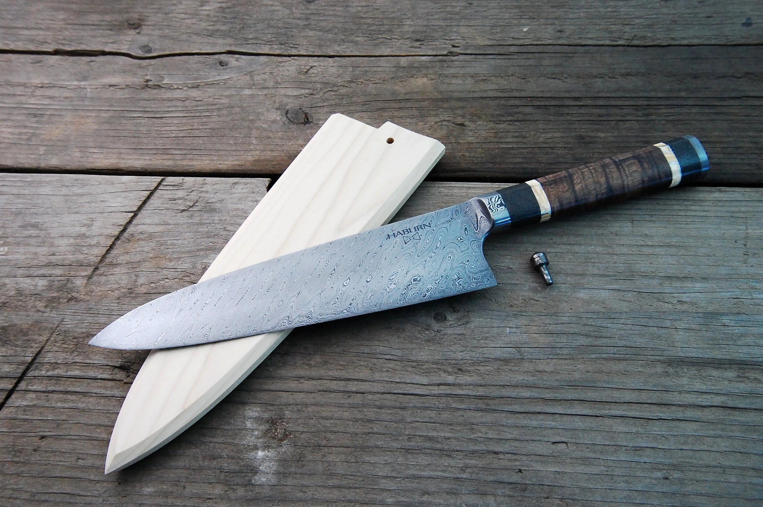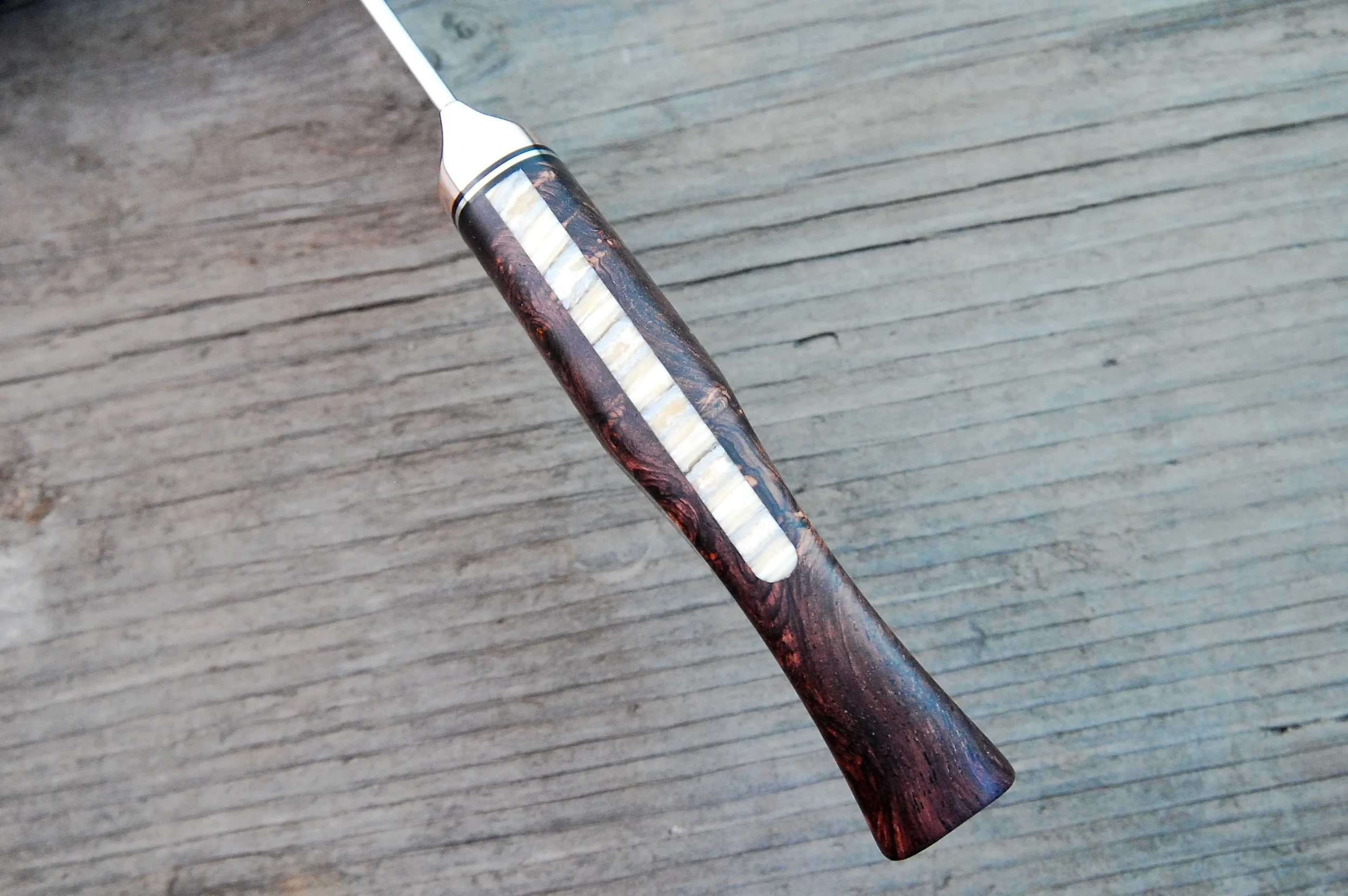 Custom Euro chef in 52100 saddled up in mokume-gane and rosewood burl with mammoth tooth inlay. Poplar saya with mokume-gane pin.