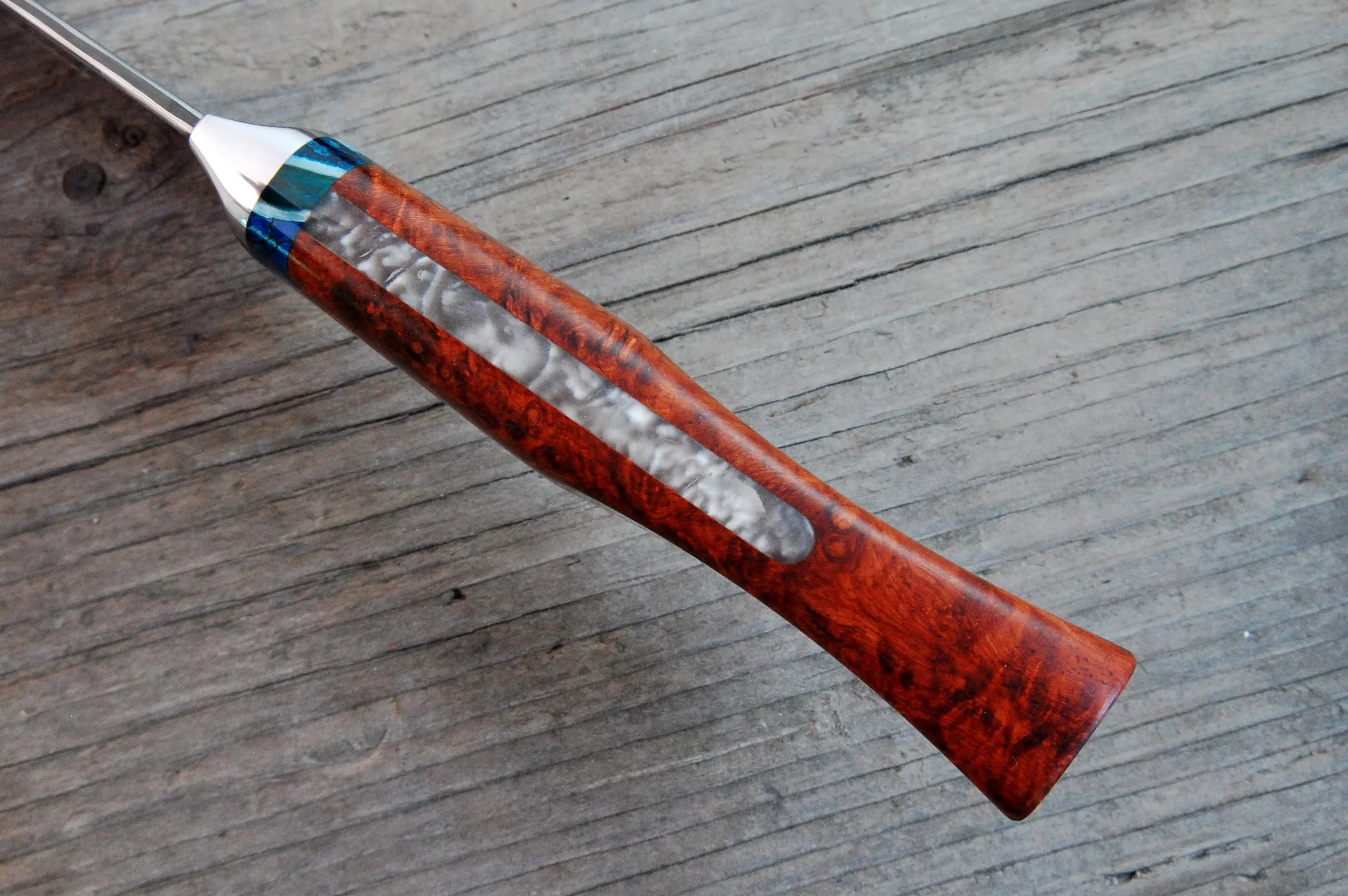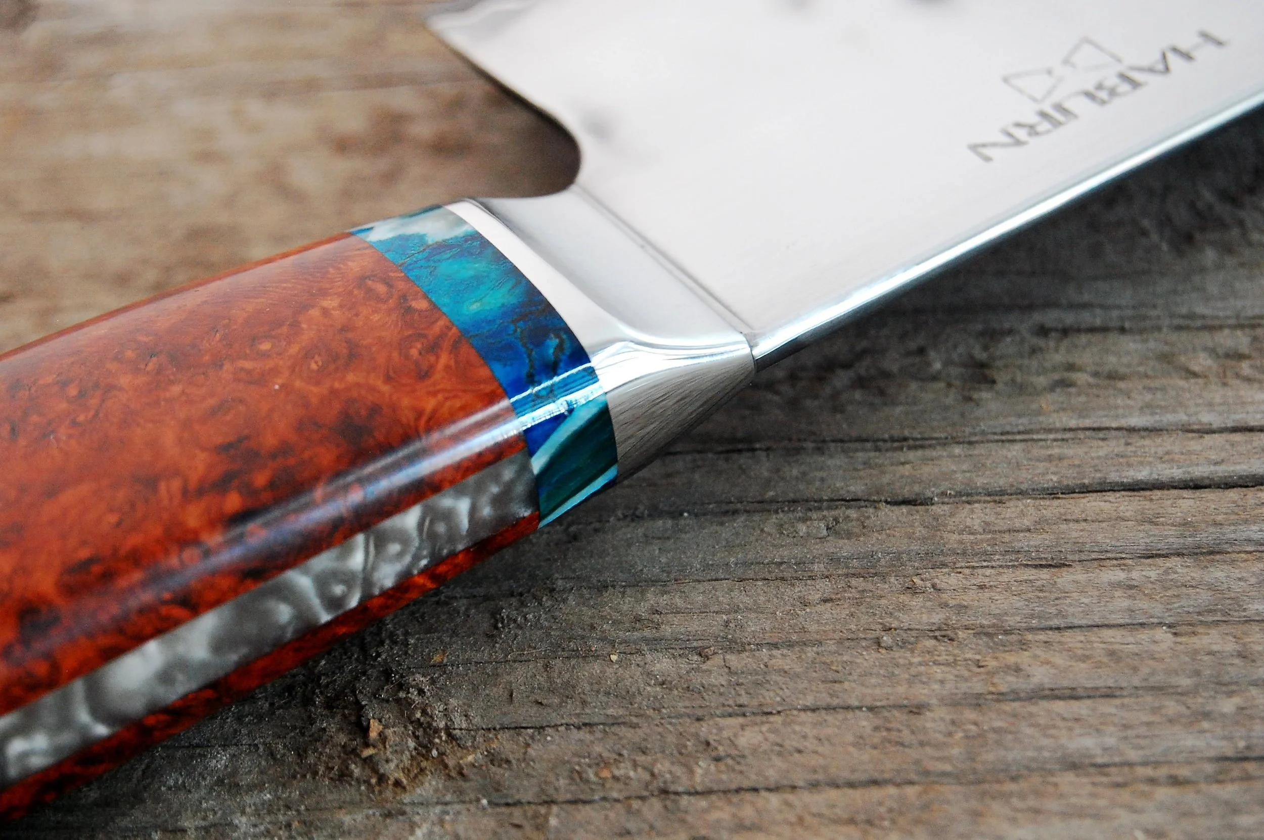 Custom big boi stainless san mai Western gyuto saddled up in stainless bolster, mammoth tooth, and musk ox inlay into blood orange amboyna burl