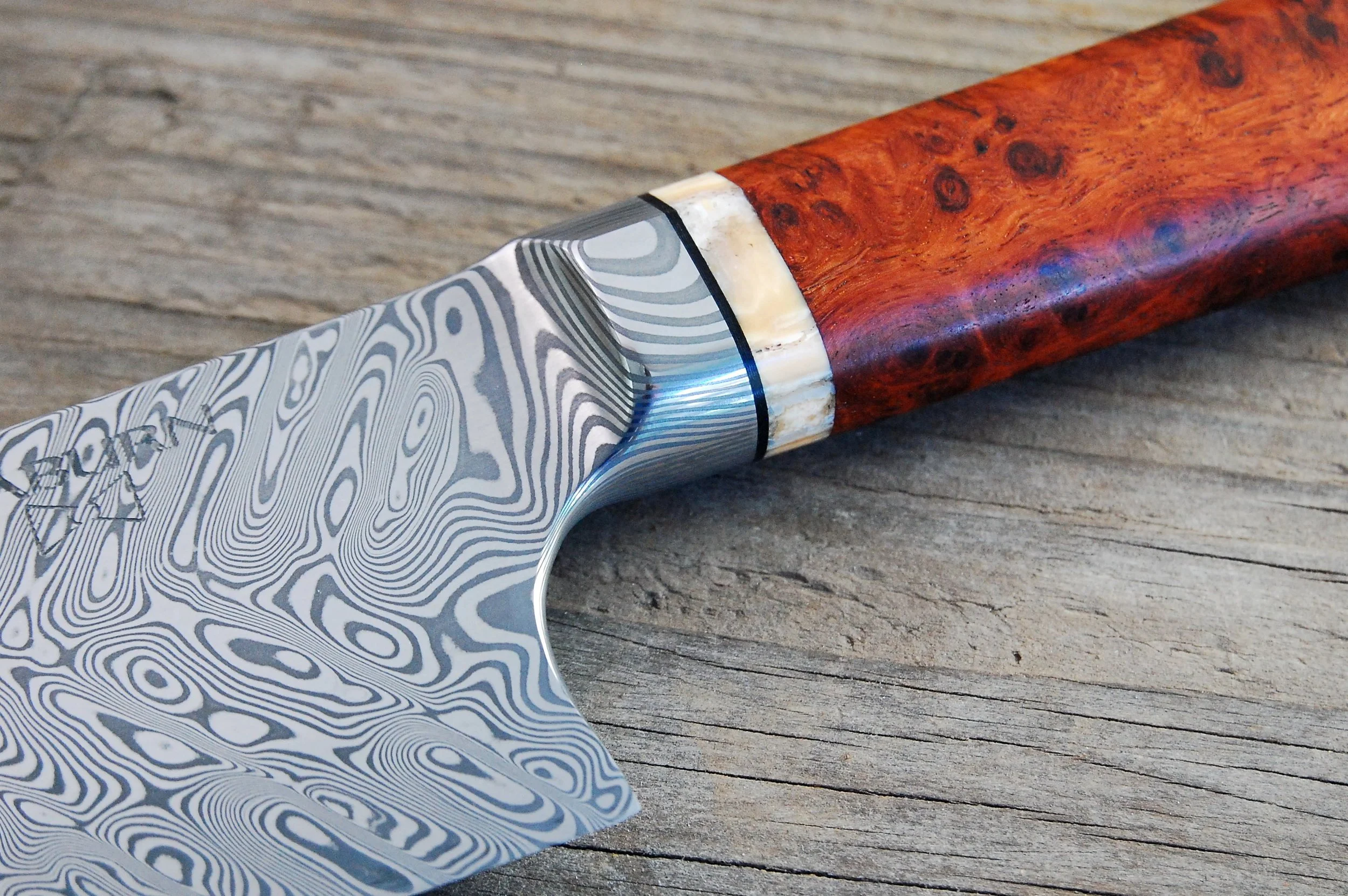 Custom stainless chevron damascus integral gyuto handled in mammoth tooth and burnt orange amboyna burl.