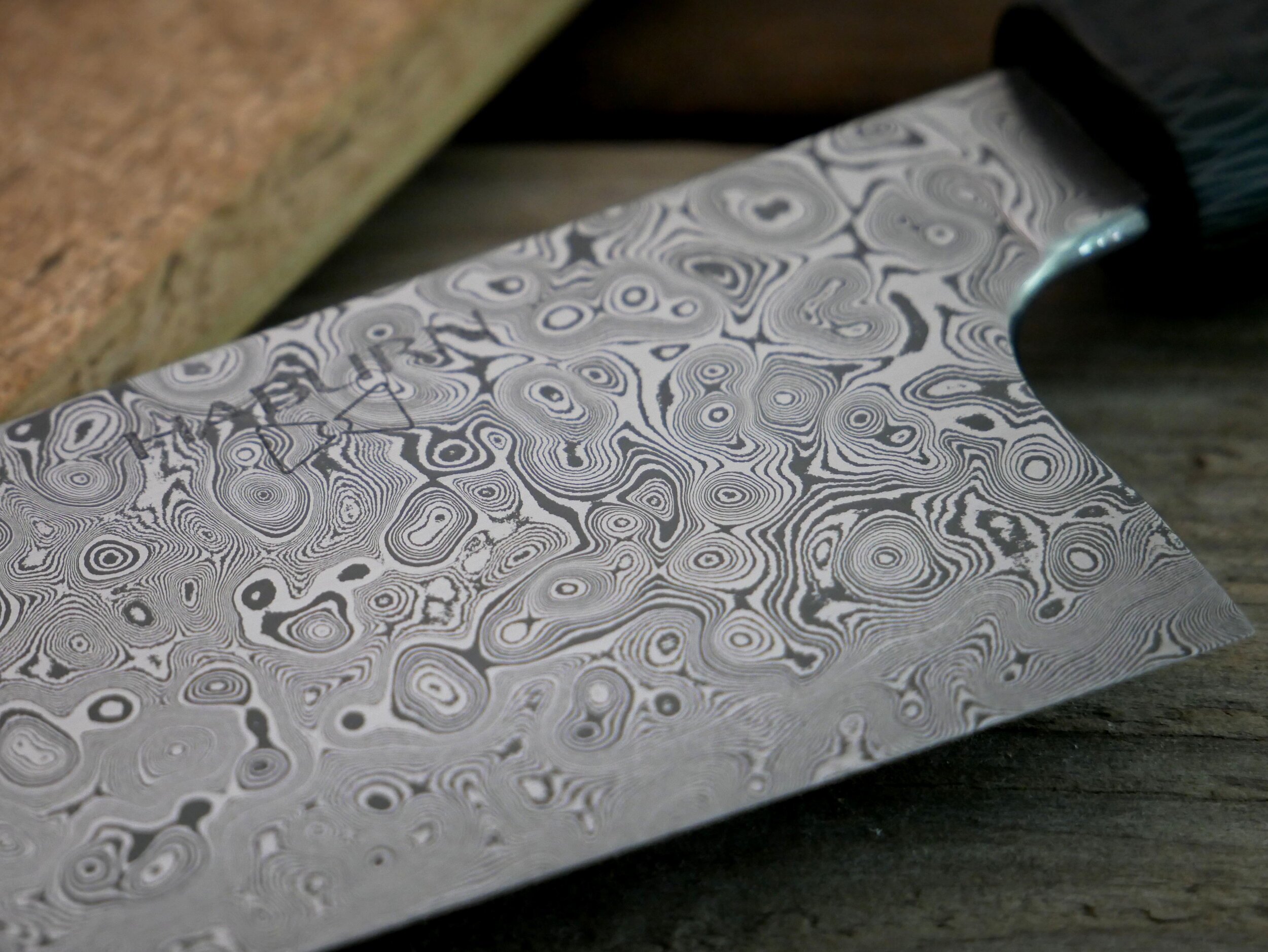 Custom Raindrop Damascus Gyuto Handled in Carbon Fiber, Spalted Tamarind, and Curly Hawaiian Koa