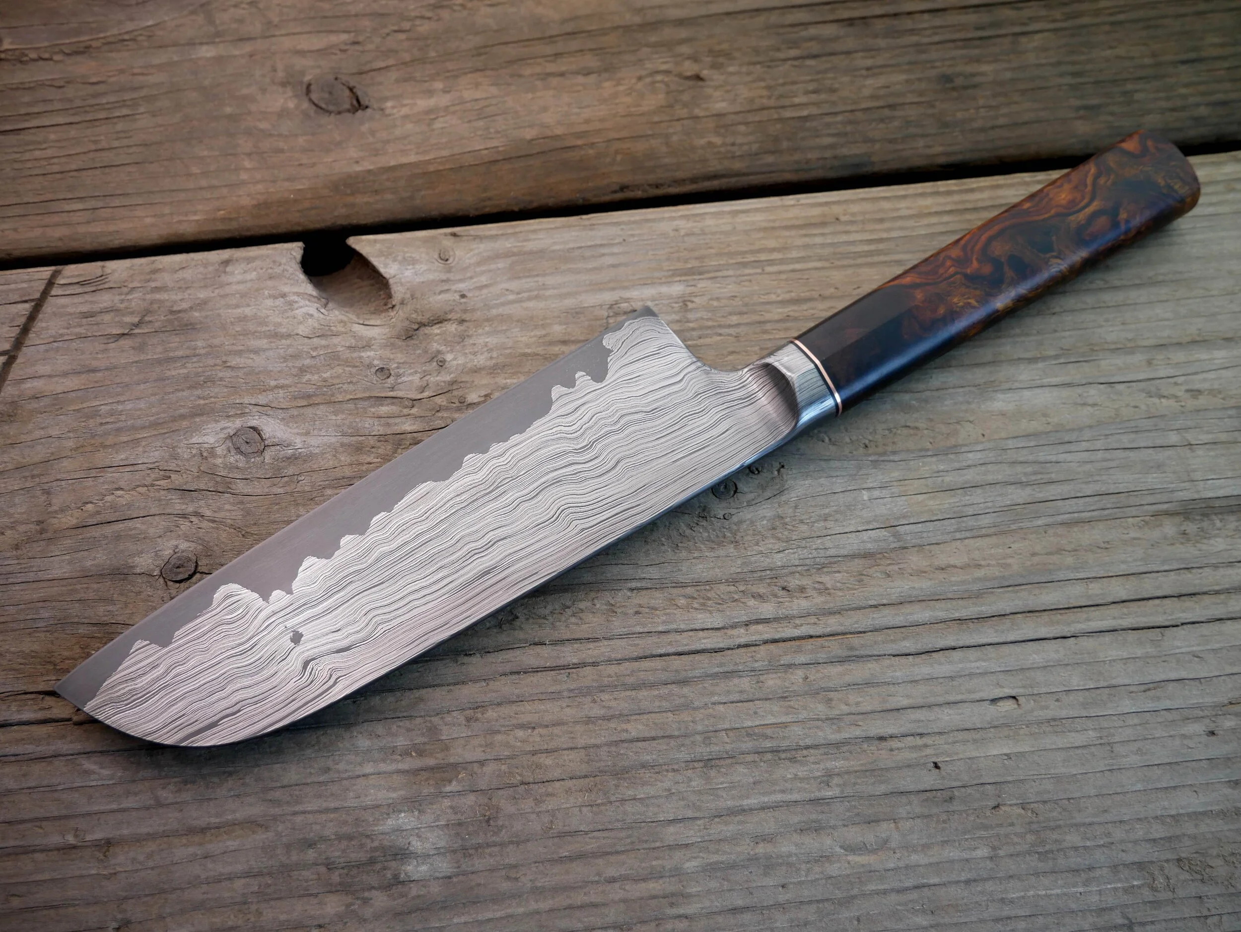 Custom Integral Damascus San Mai Santoku Jan 12 Written By Megan Rogers Custom Integral Midnight Ripple Damascus San Mai Santoku in Ironwood Burl Megan Rogers