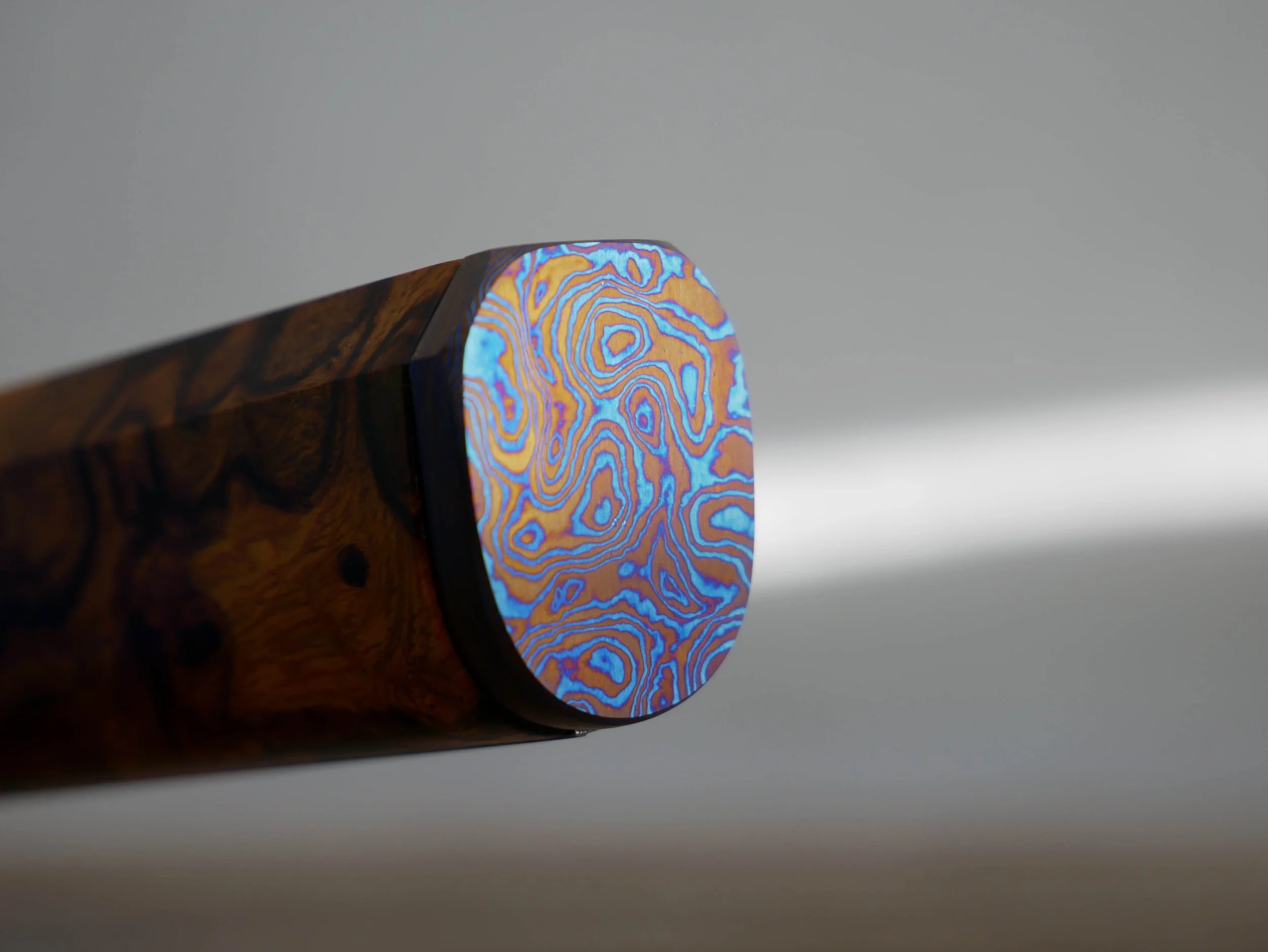 Custom stainless damascus full tang integral honesuke wearing ironwood burl and a Timascus buttcap and faceted titanium pin.