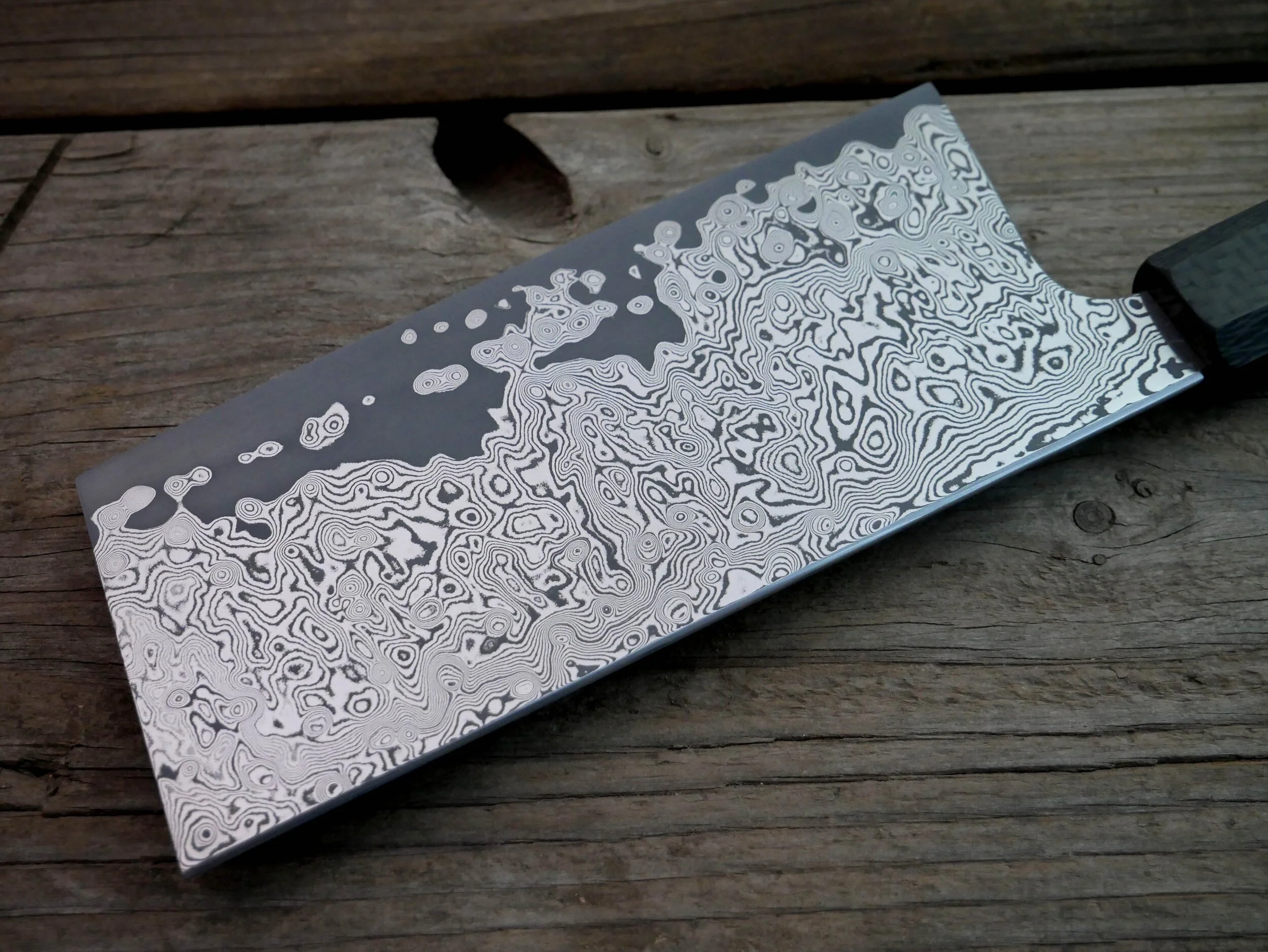 Custom Stainless Damascus San Mai Vegatable Cleaver Jul 6 Written By Megan Rogers Stainless damascus vegatable cleaver handled in carbon fiber and dyed maple burl. Megan Rogers