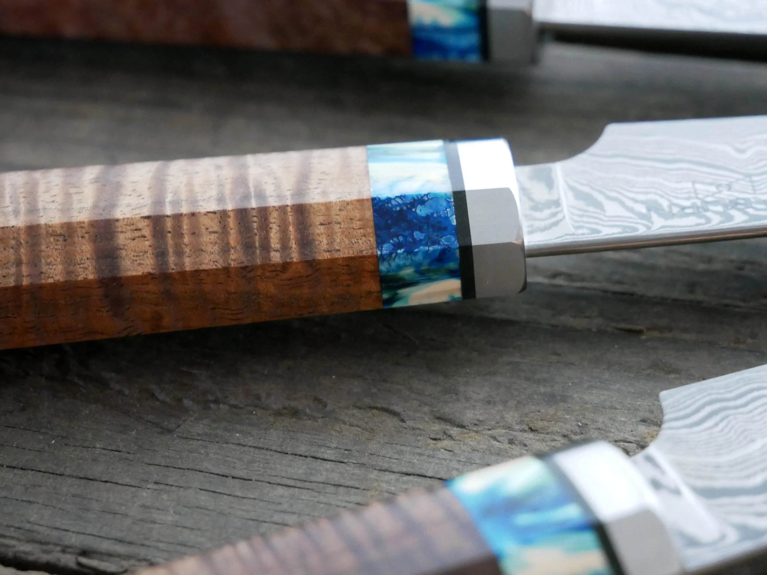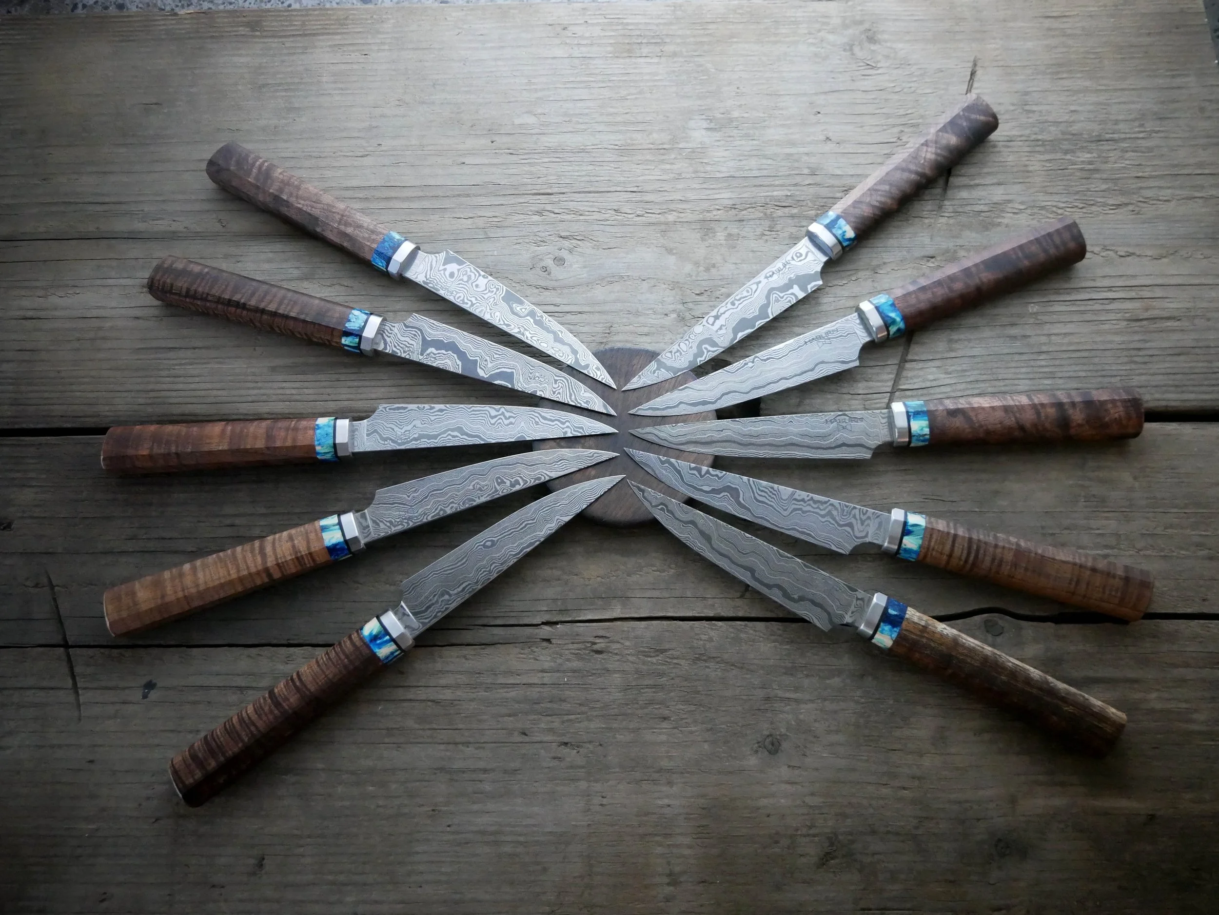 Custom high carbon damascus steak knife set handled in a stainless bolster, mammoth tooth, and Hawaiian koa.