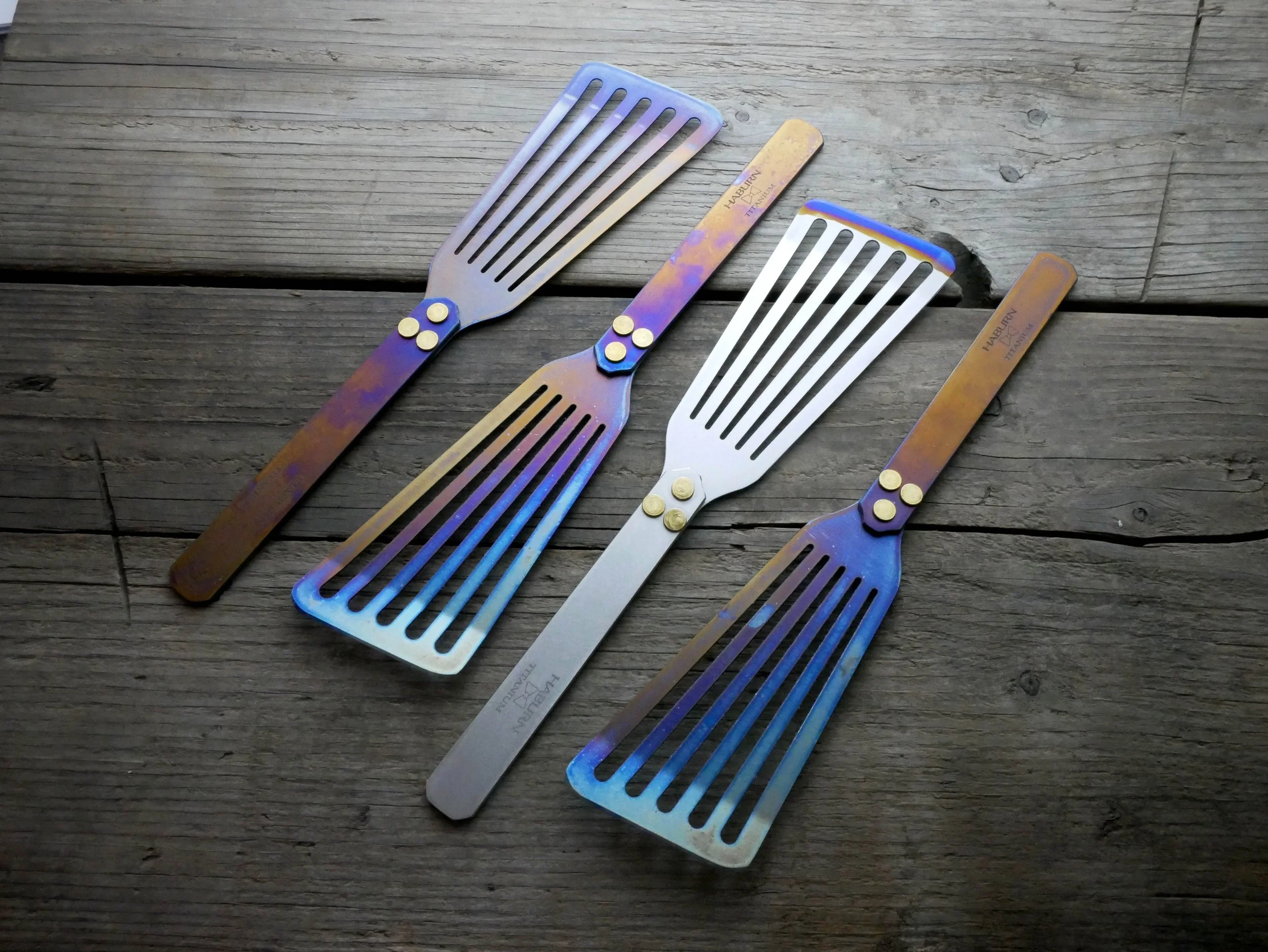 The Flexible Titanium Spatula excels at most common kitchen tasks. Small to large fish fillets are two examples of what this titanium spatula is great for. The titanium alloy and design used for this spatula allows medium bends and returns right back to the original shape for years of enjoyment. They will be available with anodized tips and Nebulous heat coloring.