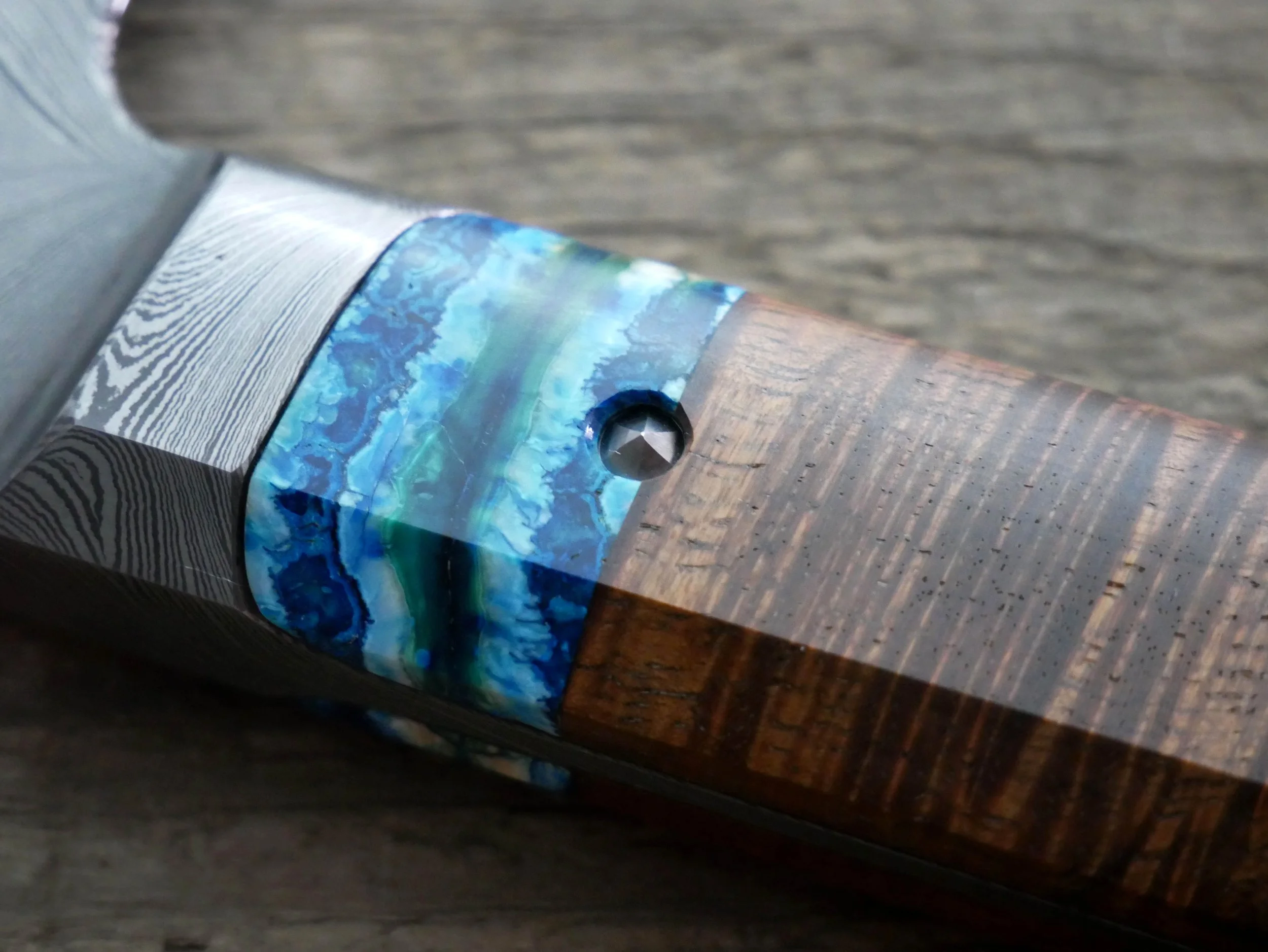 Damascus Full Tang Integral with extra large handle in mammoth tooth and Hawaiian koa held together with faceted pins.